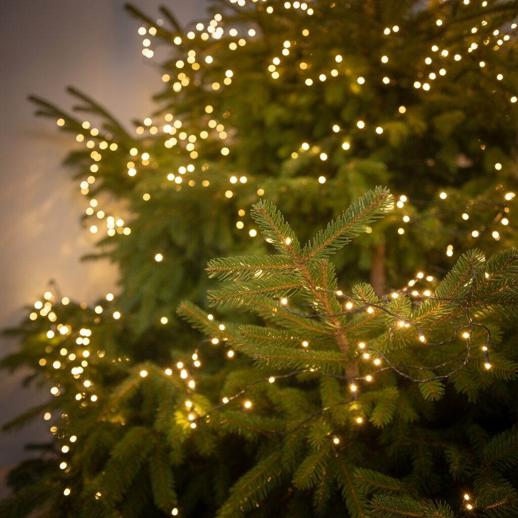 Tuck extra fairy lights into sparse areas. Lights illuminate the tree from all angles and fill visual gaps effectively.