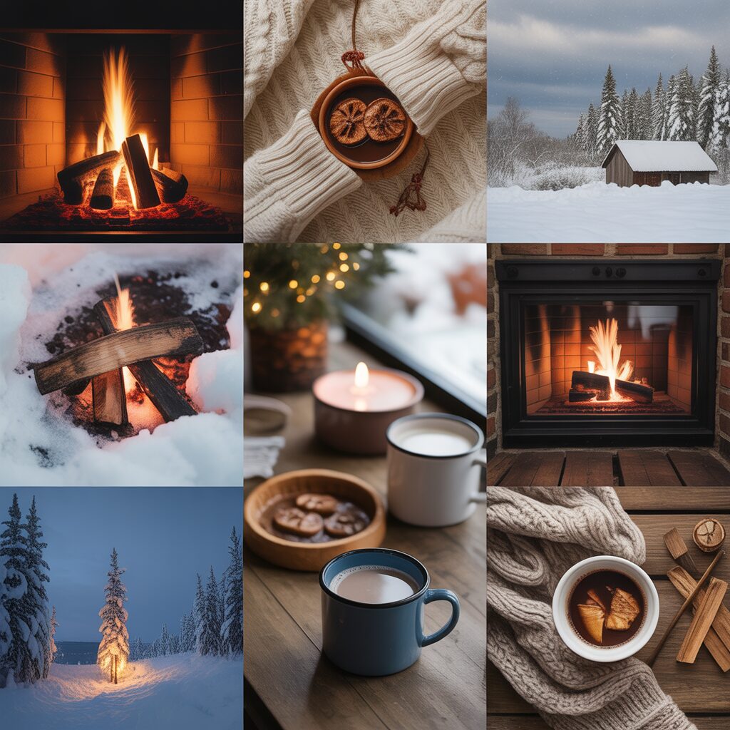 Include fireplaces, knitted textures, mugs of cocoa, and snowy skies to create a warm atmosphere. This collage gives your screen a comforting winter feel.