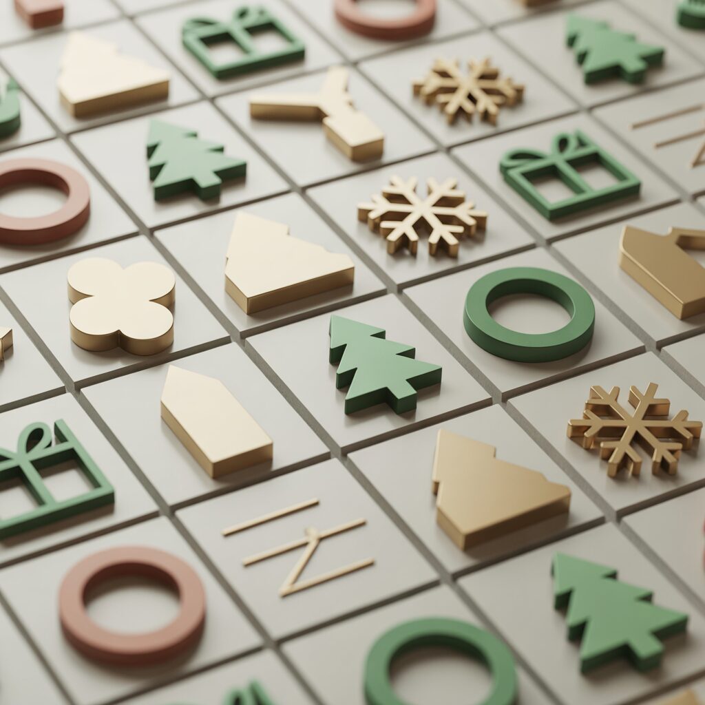 Use simple icons, clean shapes, and soft tones arranged in neat grids. This collage offers a modern Christmas look without overwhelming your screen.