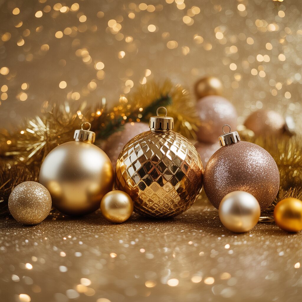 Mix shimmering ornaments, glitter effects, and elegant golden tones. This luxurious collage adds shine and sophistication to your holiday background.