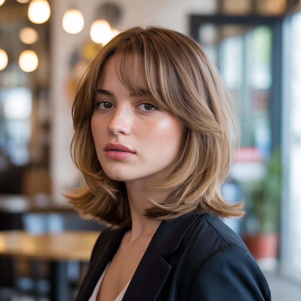 How it’s created: A long bob is cut with soft layers, while curtain bangs taper at the sides to blend seamlessly.