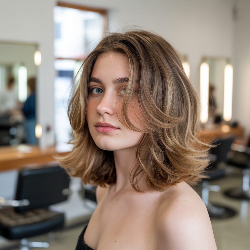 How it’s created: Hair is cut to shoulder length with feathered or razored layers. Styling includes loose curls or waves for volume.