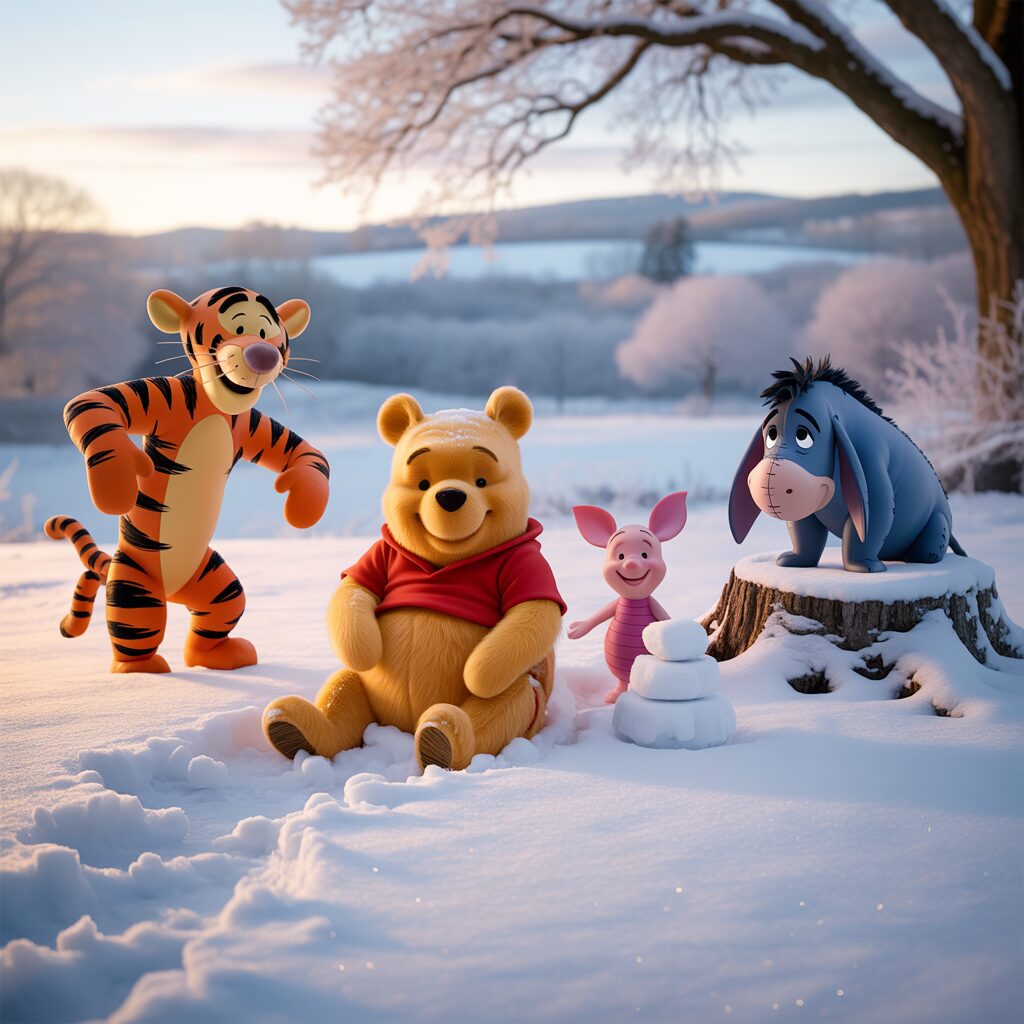 Pooh, Tigger, Piglet, and Eeyore enjoying winter activities create a heartwarming vibe. The soft colors and gentle scenes make these wallpapers cozy and comforting.