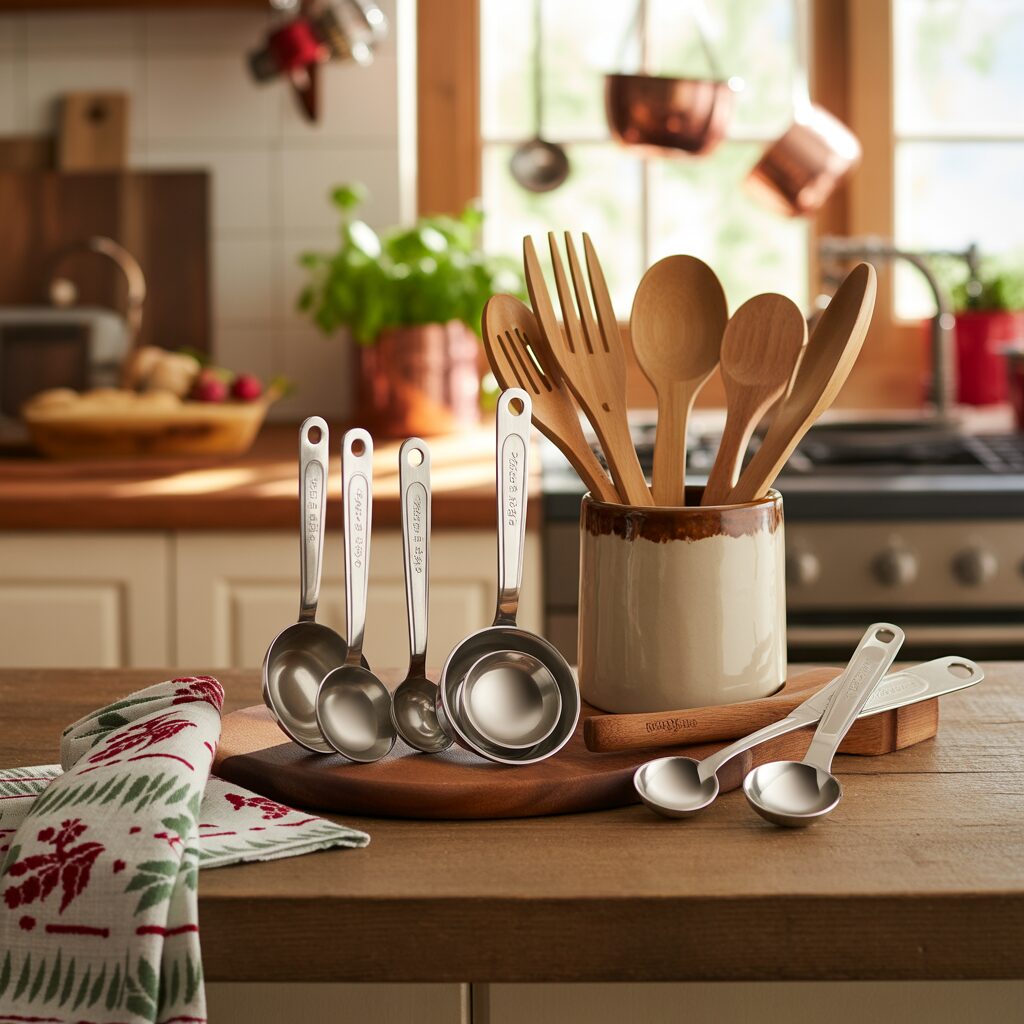 Gift utensils, measuring spoons, or holiday-themed kitchen towels. These useful items are perfect for anyone who enjoys cooking.
