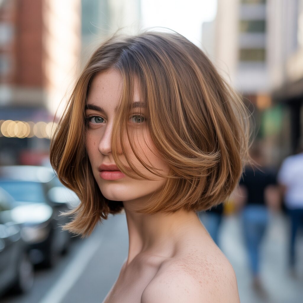 How it is different: Instead of a blunt bob, a layered bob with a side part introduces movement, which slims wider cheeks and highlights the eyes.