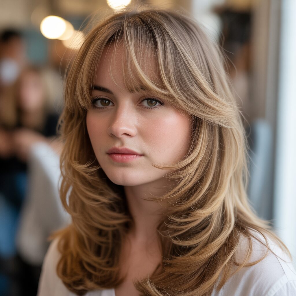 2. Feathered Layers with Bangs – Face-Framing Elegance