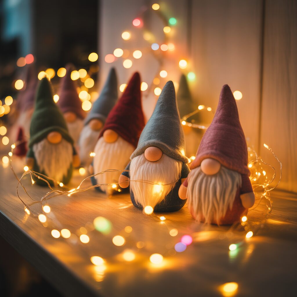 Use warm white or multicolored lights to highlight gnome ornaments. The lights create a magical glow and emphasize the whimsical design.
