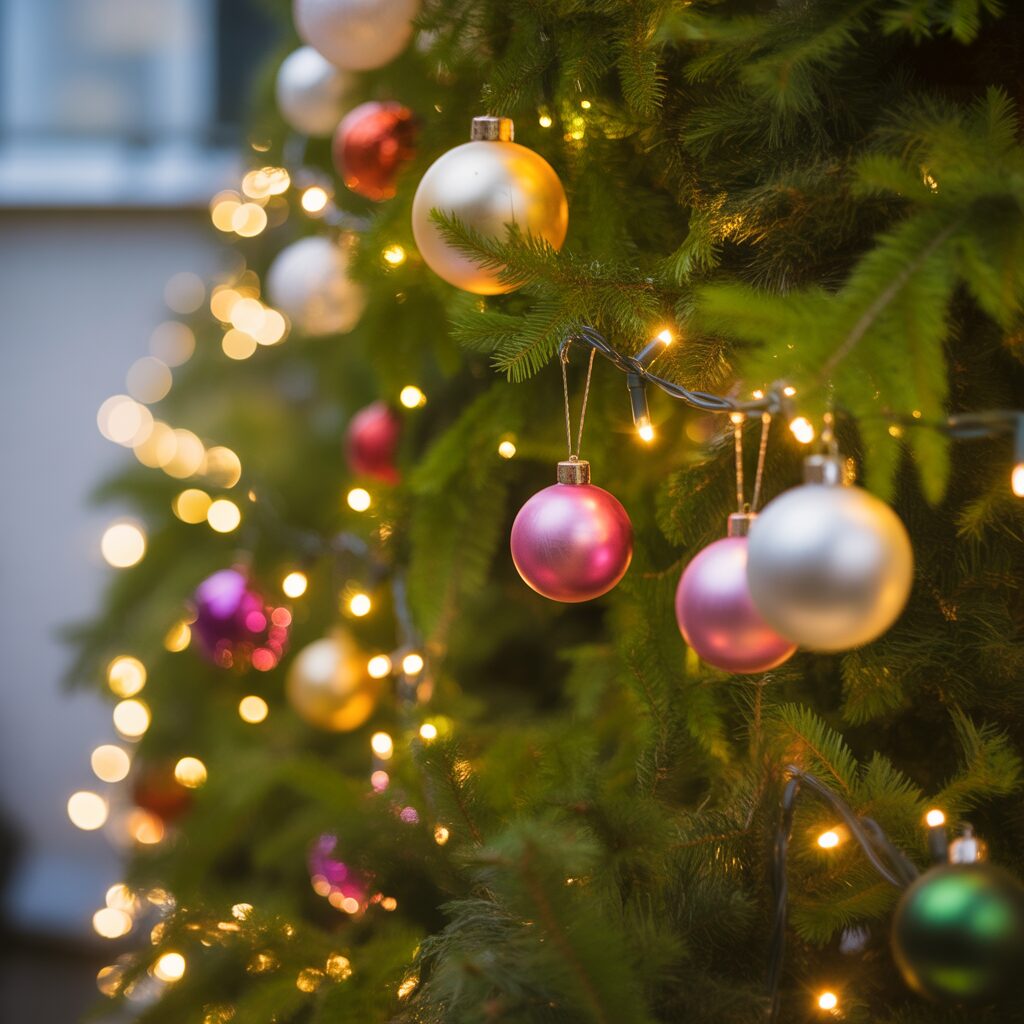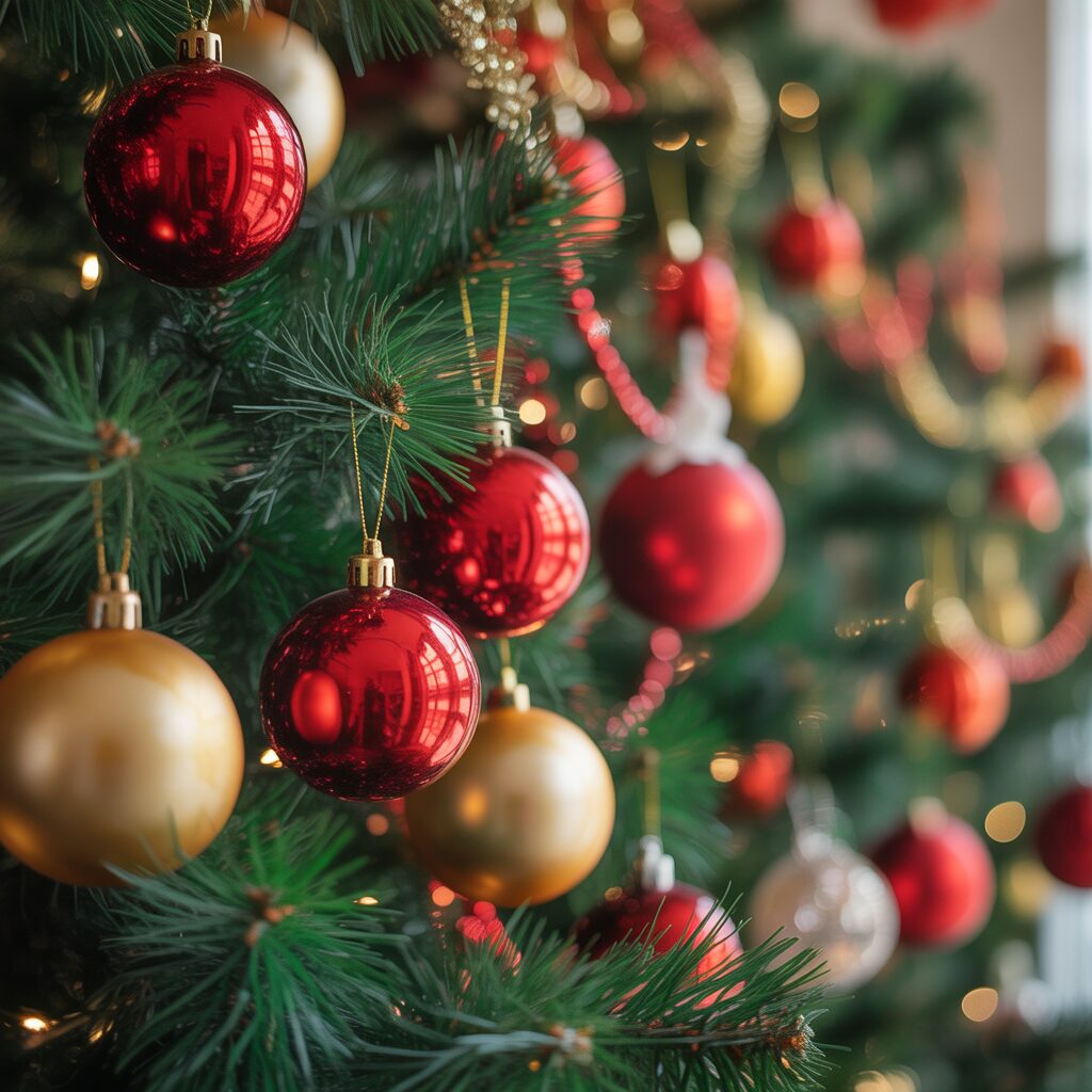Combine red and gold ornaments for a classic look. These colors pop against green branches and create a timeless festive appeal.
