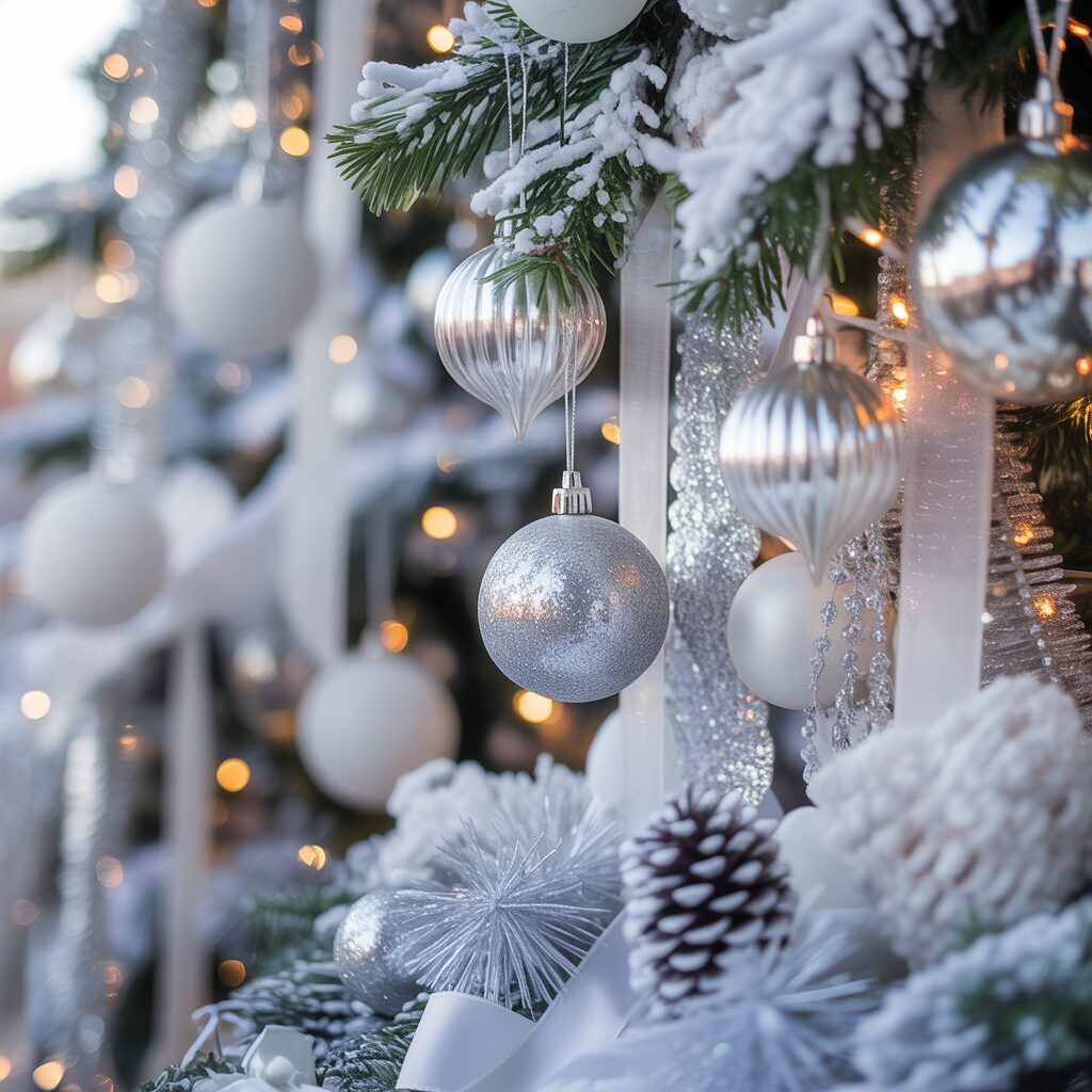 Use white and silver decorations to evoke a snowy, wintery feel. Metallic and glittery accents add elegance and sparkle.
