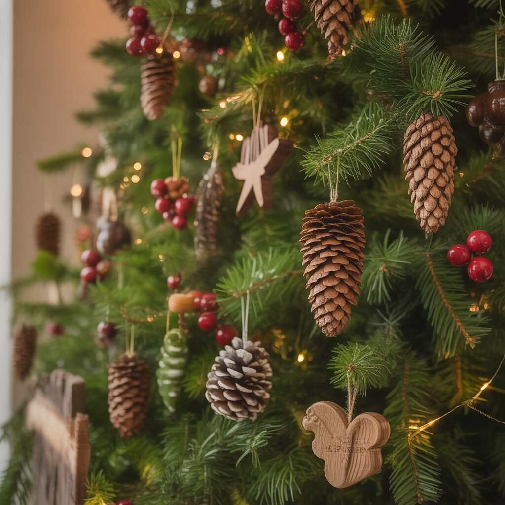 Incorporate pinecones, berries, and wooden ornaments. Natural elements enhance the tree’s greenery and add rustic charm.