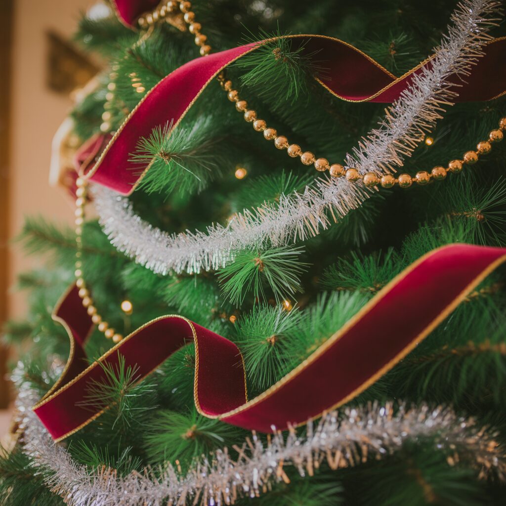 Drape ribbons, tinsel, or bead garlands around the tree. These accents fill spaces and add texture while complementing the green backdrop.
