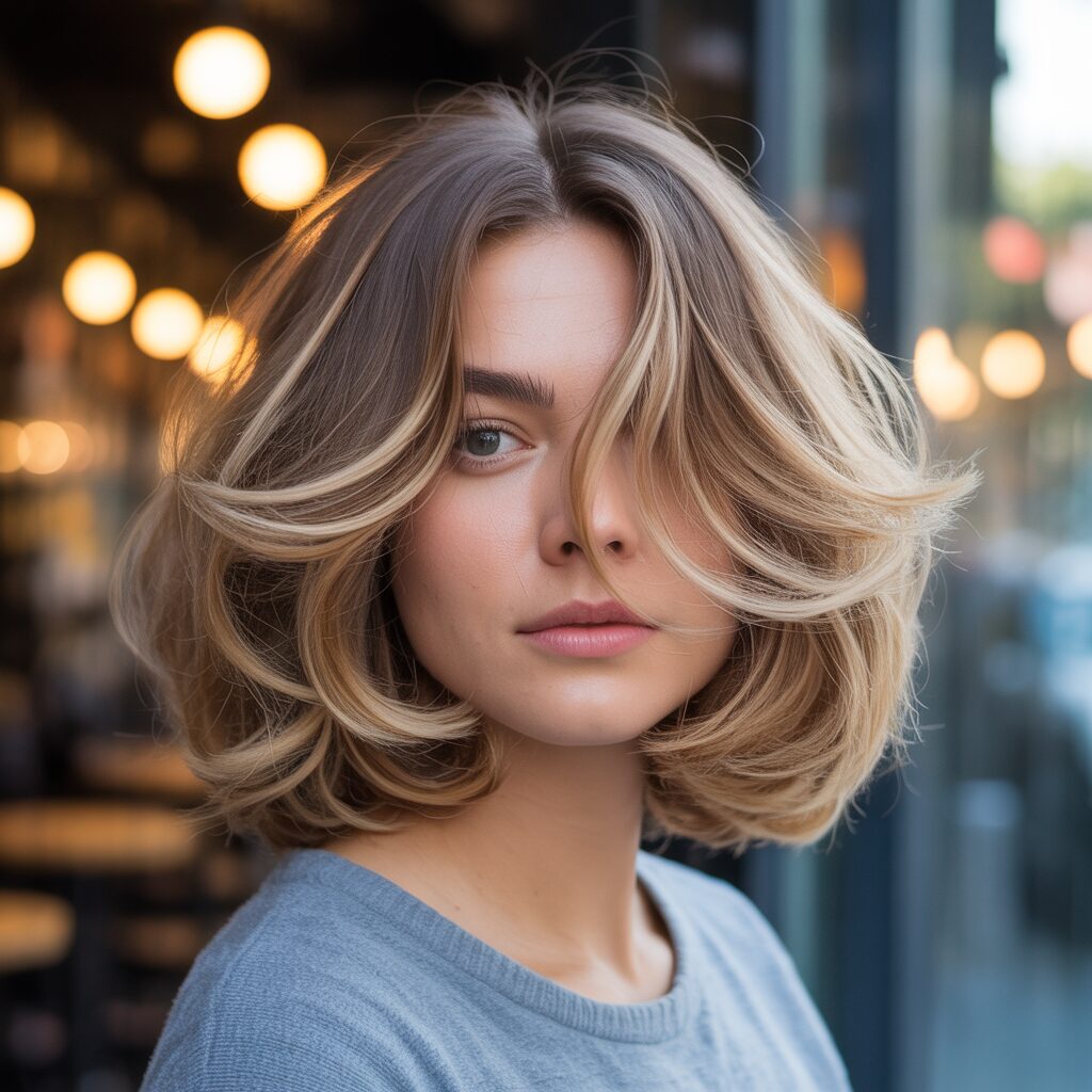 How it is different: Unlike sleek bobs that highlight cheekbone width, this version uses waves and layers to soften the sides and balance the face.