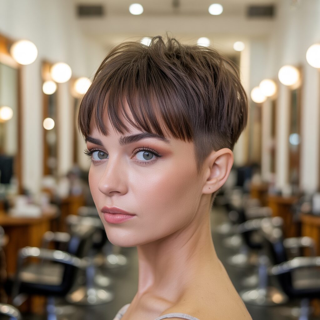 How it’s created: Hair is cropped short around the sides and back, with longer layers on top and bangs across the forehead.