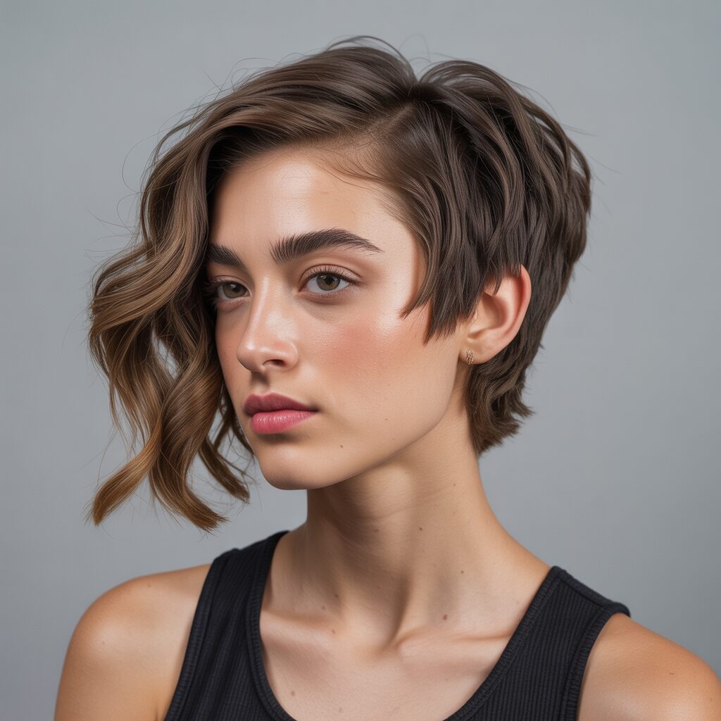 How it’s created: Hair is cropped short on one side, with a longer section styled sleek or wavy on the opposite side.