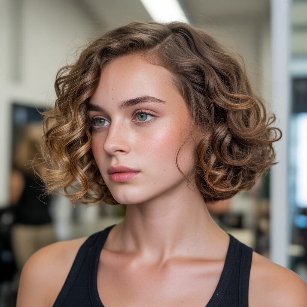 How it’s created: Hair is cut to chin length or slightly longer, styled with a deep side part and defined curls.