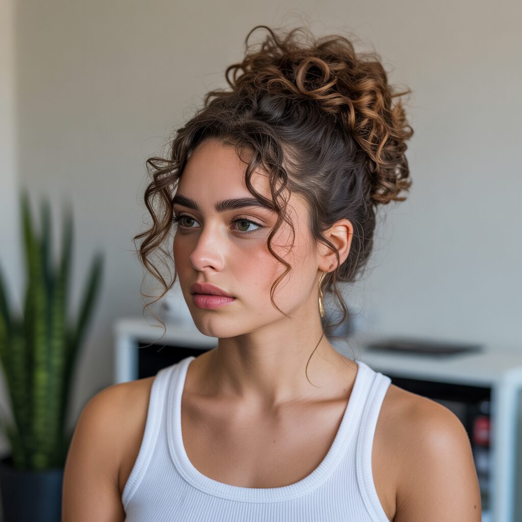 The pineapple updo lifts curls to the top of the head, protecting them while showcasing volume. Unlike flat updos, this style preserves curl shape and adds height. Inspired by natural hair care techniques and modern protective styling, it’s ideal for casual wear or as a statement style.