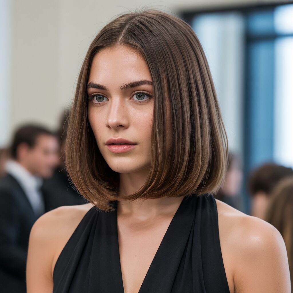A sleek, straight style emphasizes shine and smoothness, giving medium-length hair a sophisticated and modern appearance. Unlike textured or layered styles, straight hair offers a minimalist, elegant aesthetic. This style is inspired by runway fashion and celebrity red-carpet trends, perfect for formal or professional settings.