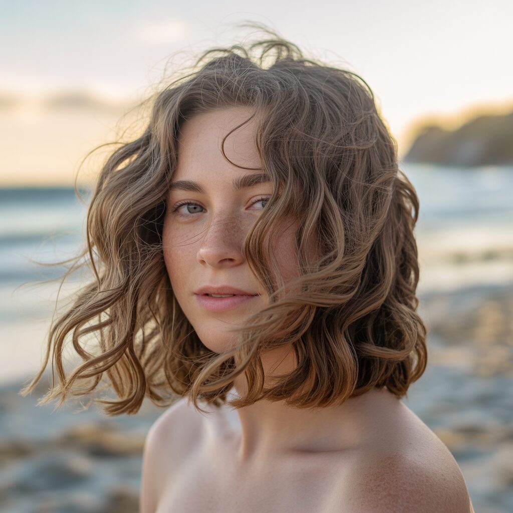 Beach waves add soft, tousled curls that give medium hair a relaxed and voluminous look. Unlike straight hair, waves provide texture and movement that can be casual or semi-formal. This style is inspired by California beach culture and 1970s bohemian fashion, offering a carefree yet stylish aesthetic.