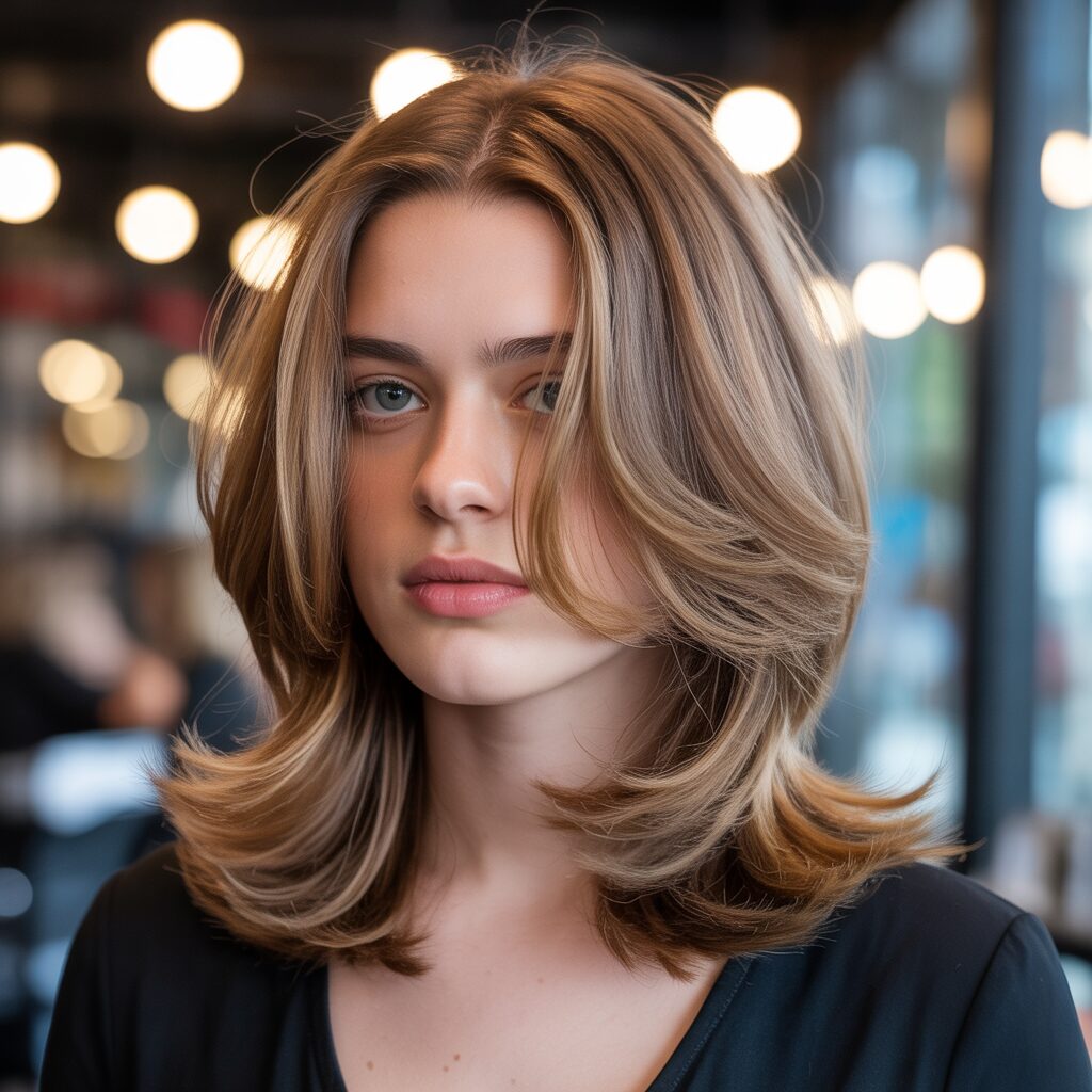 A layered shoulder-length cut adds movement and dimension, helping to elongate a round face. Unlike blunt cuts that may accentuate roundness, layers create a soft frame around the face. This style is inspired by modern celebrity haircuts seen on Hollywood actresses, designed to balance facial proportions while maintaining a feminine and elegant look.