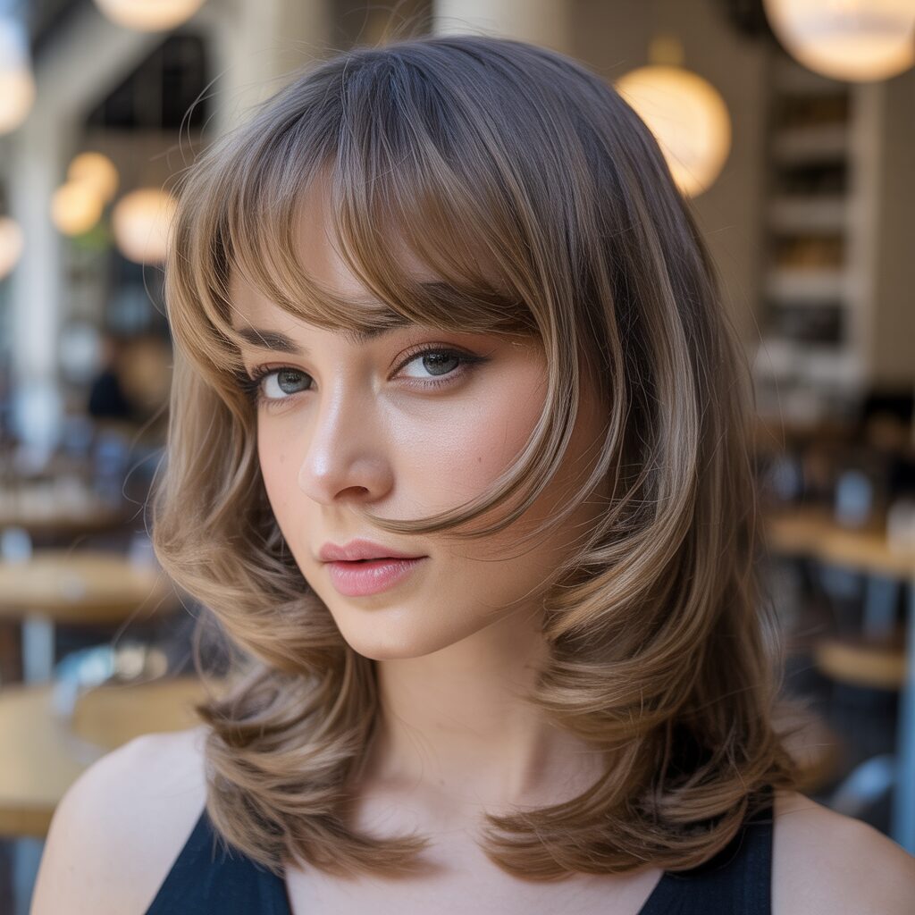 Side-swept bangs are perfect for breaking the symmetry of a round face. Unlike straight-across bangs that can emphasize fullness, angled bangs create the illusion of length and a slimmer face. This style draws inspiration from French and European fashion trends, where subtle angles and soft layers are used to highlight natural beauty and structure.