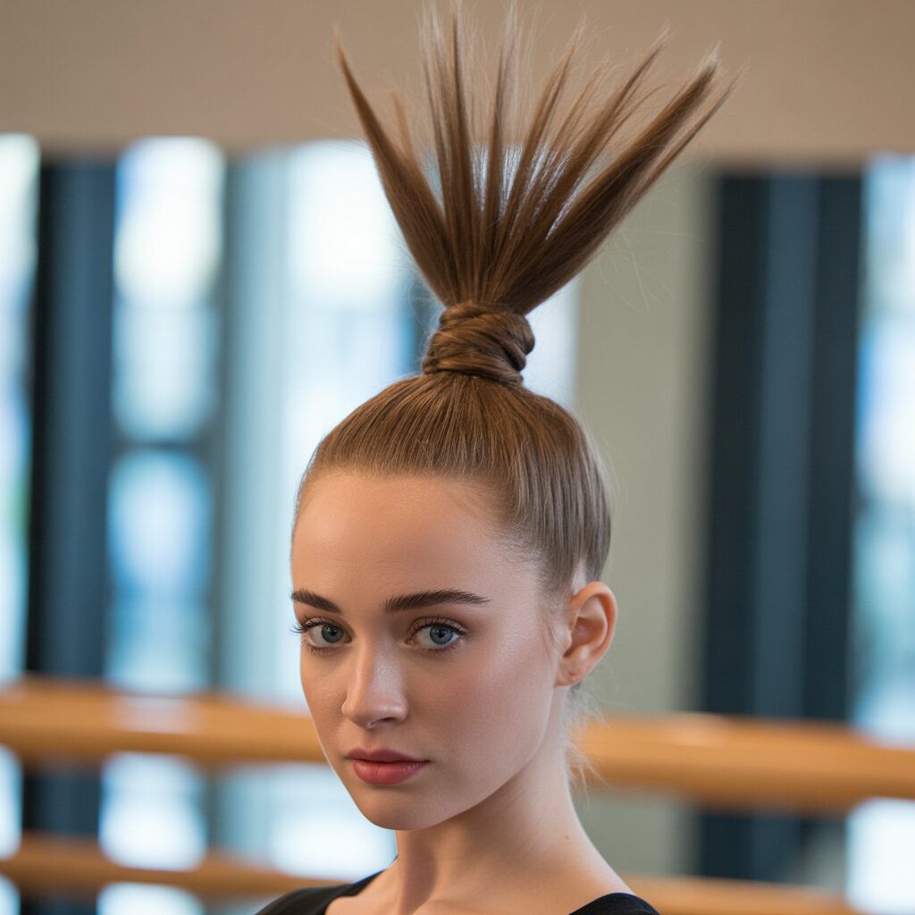 High ponytails or top knots add height and vertical dimension, making the face appear longer and more defined. Unlike low buns or flat hairstyles, these styles create a lifting effect and showcase facial features. This look is inspired by both modern celebrity trends and classical ballerina hairstyles, emphasizing elegance, structure, and confidence.