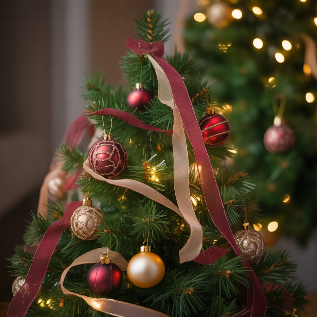 Use thin ribbons or miniature garlands. These accents add texture, movement, and festive charm without overwhelming the small tree.