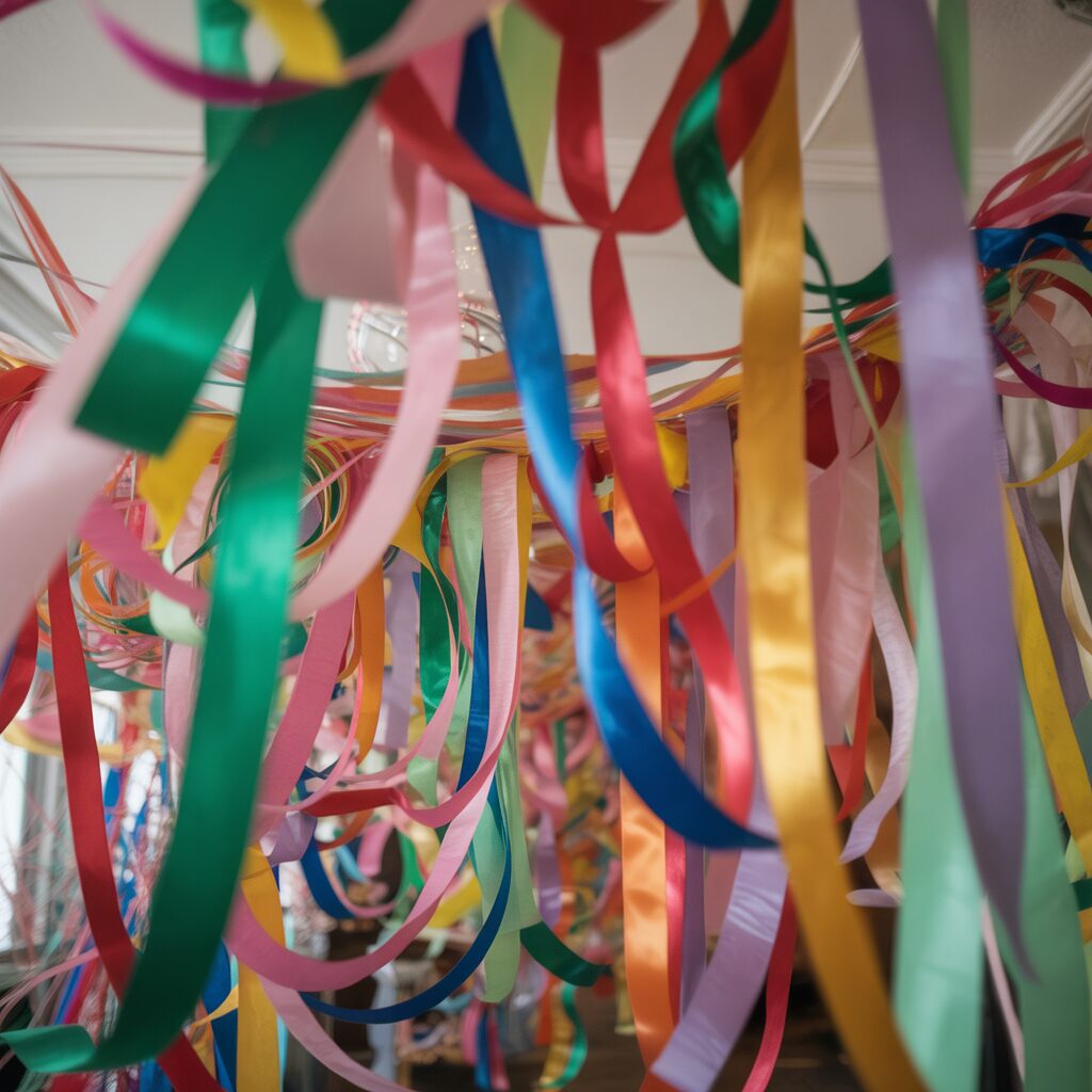 Use ribbons and garlands in multiple colors. Layering different textures and hues adds depth and playful movement to the design.