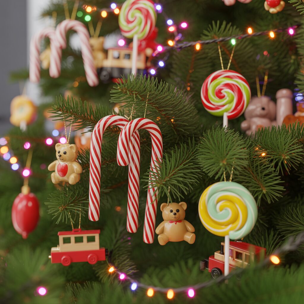Add candy canes, lollipops, or small toys as ornaments. Fun, edible, or whimsical decorations enhance the playful multi-colored theme.