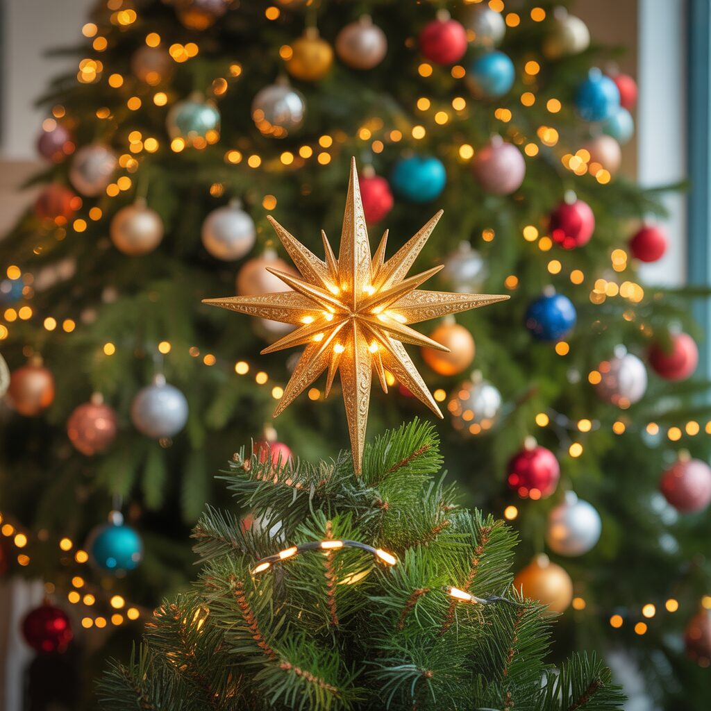 Choose a vibrant star, bow, or fun character. A colorful topper draws attention and ties together the multi-hued decorations.