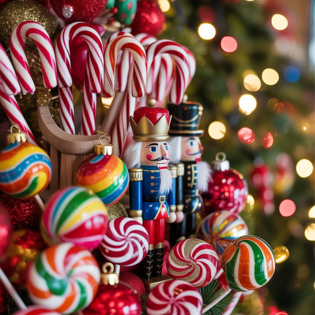 Add candy canes, lollipops, or peppermint ornaments. Sweet accents complement the playful Nutcracker theme and add festive color.