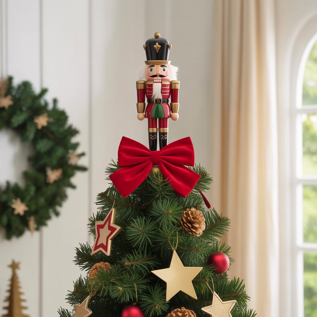 Place a larger Nutcracker figure, star, or bow at the top. A themed topper serves as a focal point and completes the festive design.