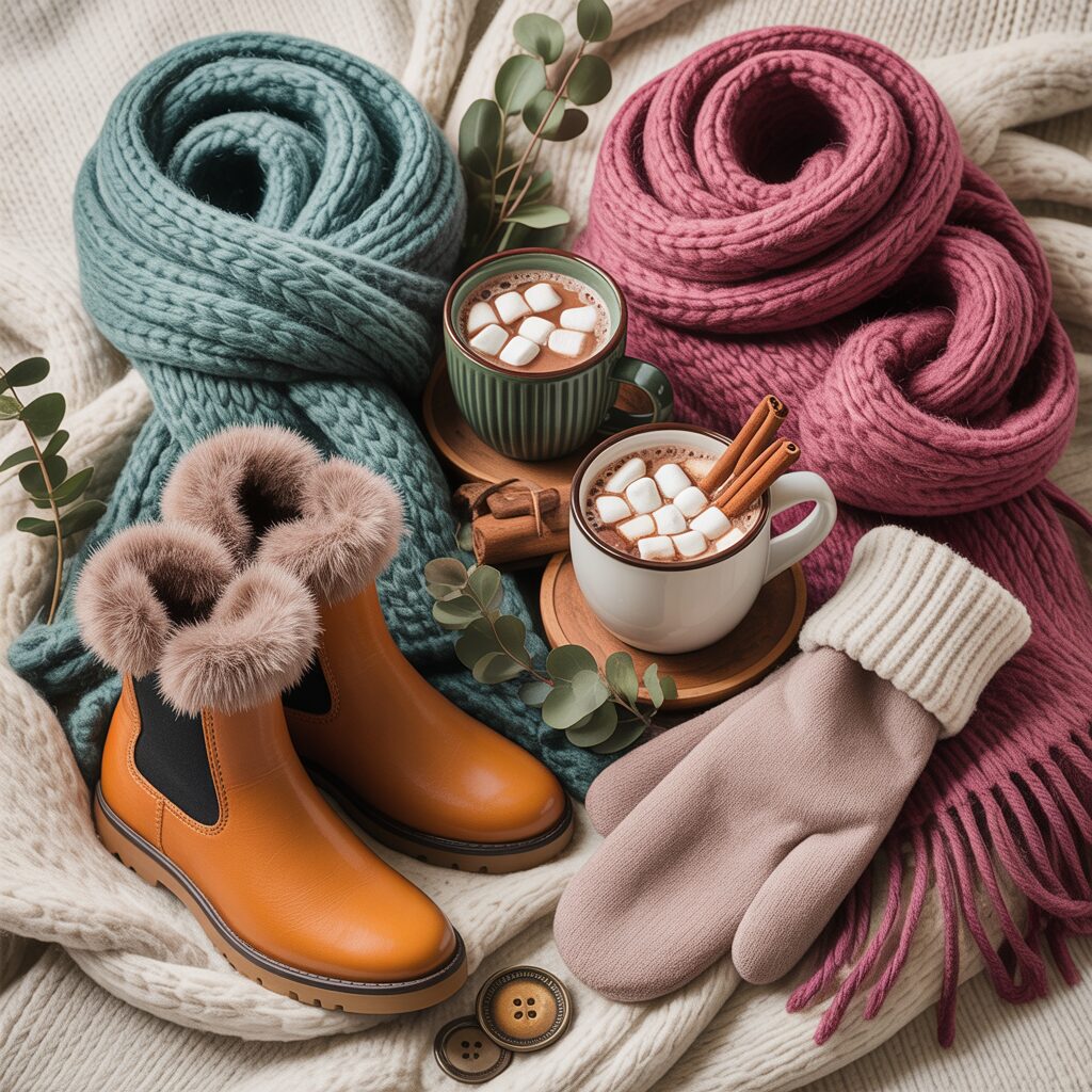 Illustrations of scarves, boots, and hot cocoa mugs in curated color palettes create a fashionable festive mood. These designs merge seasonal charm with preppy style.