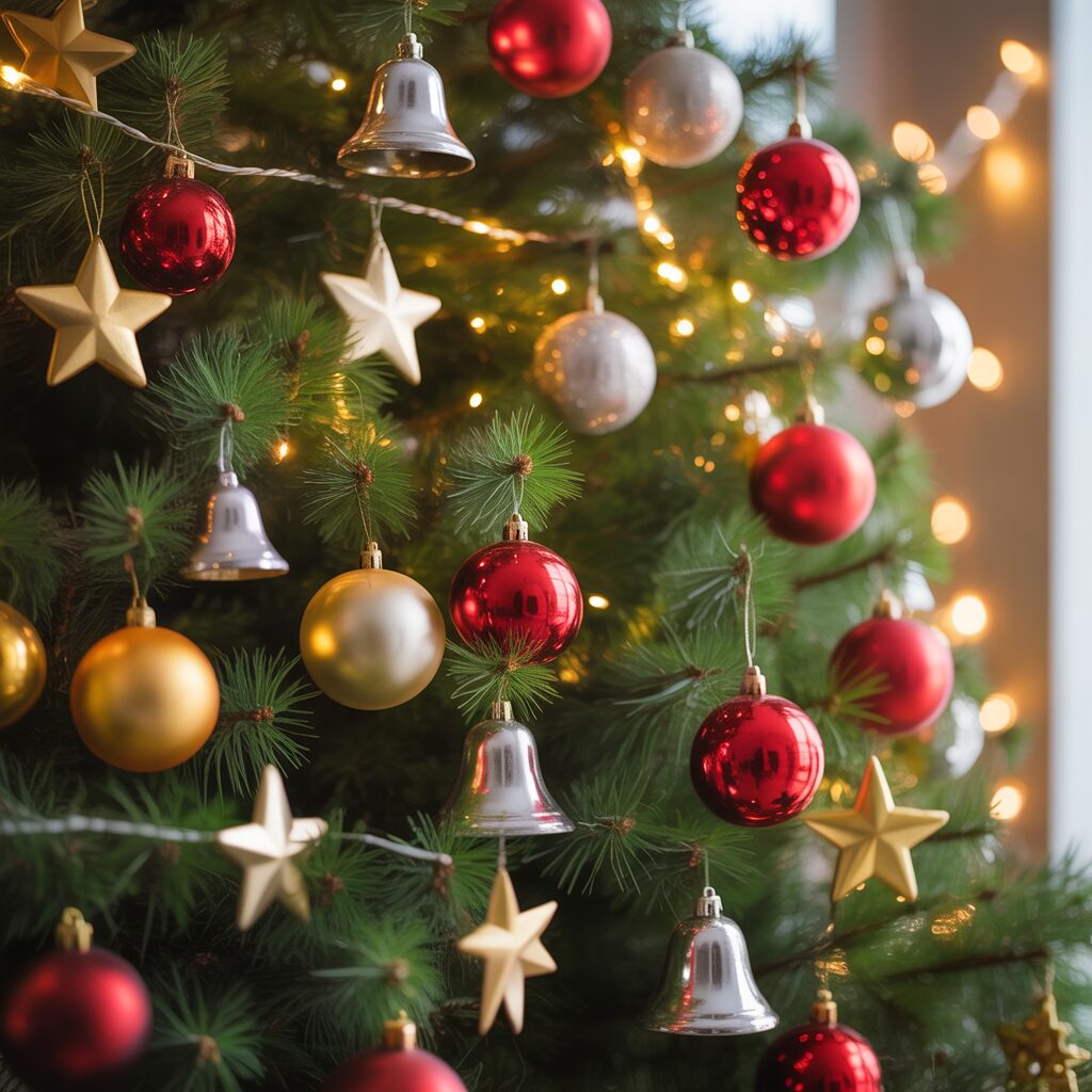 Use traditional baubles, bells, and stars. Classic ornaments complement the natural green of the tree and create a timeless holiday look.