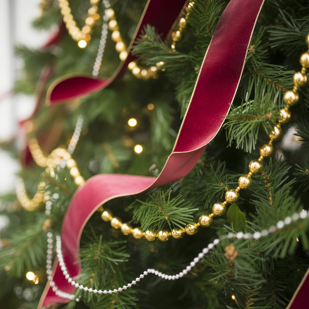 Drape ribbons, tinsel, or bead garlands throughout the branches. These accents add texture, depth, and a festive flair to the tree.