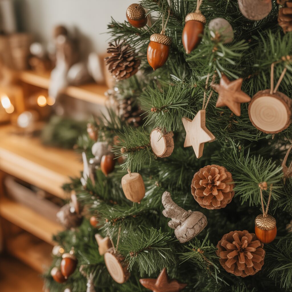 Use pinecones, acorns, and wooden ornaments. These elements highlight the tree’s earthy, rustic charm while keeping decorations simple and natural.