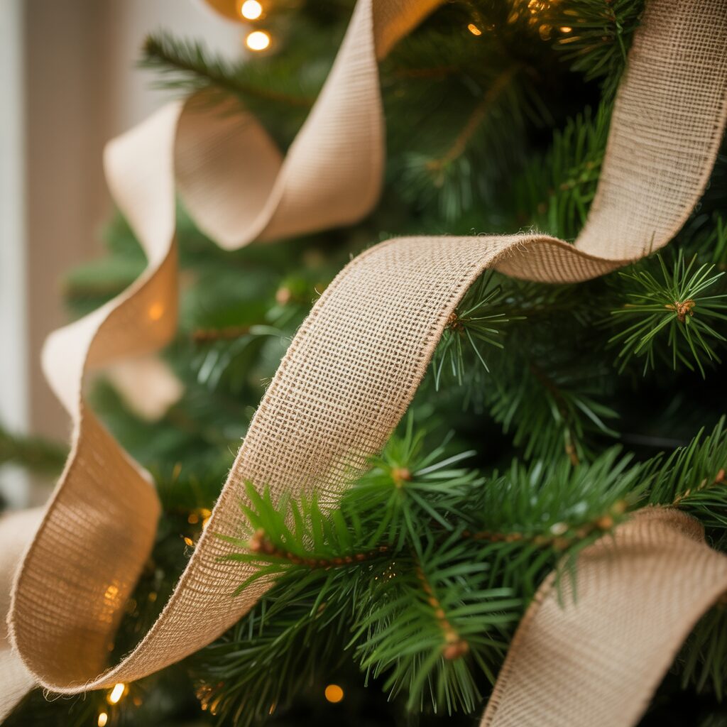Drape burlap or linen ribbons around the tree. Textured ribbons add warmth and complement the rustic, farmhouse-inspired aesthetic.