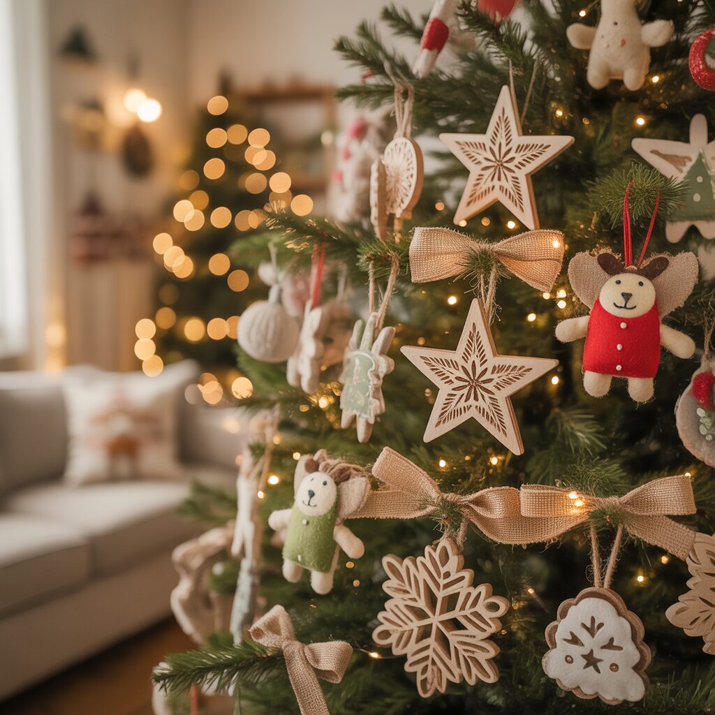 Add homemade ornaments or crafts made from wood, felt, or paper. Handmade accents give the tree a personal and charming touch.
