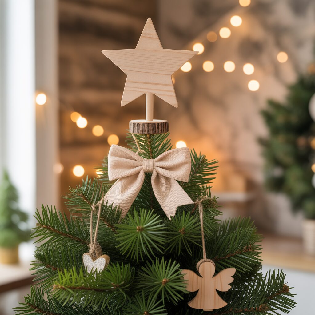 Use a wooden star, carved angel, or simple bow as a topper. Natural materials complete the rustic theme elegantly.