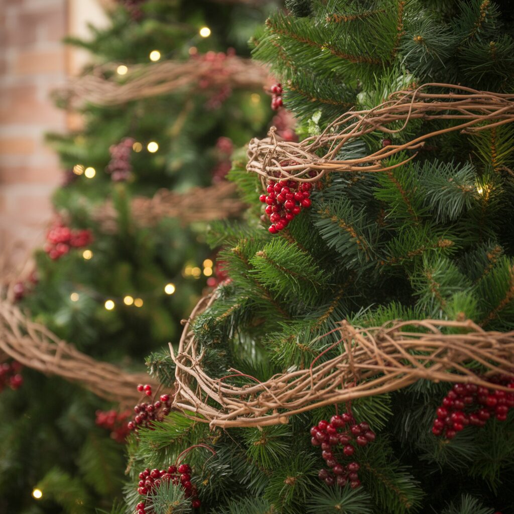 Incorporate grapevine, twine, or berry garlands. These rustic garlands add texture and movement without overpowering the natural beauty of the tree.