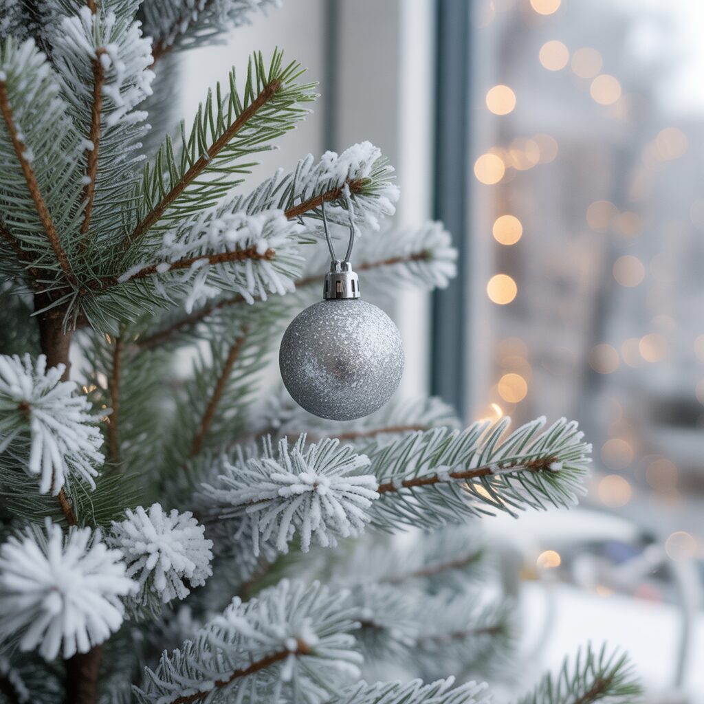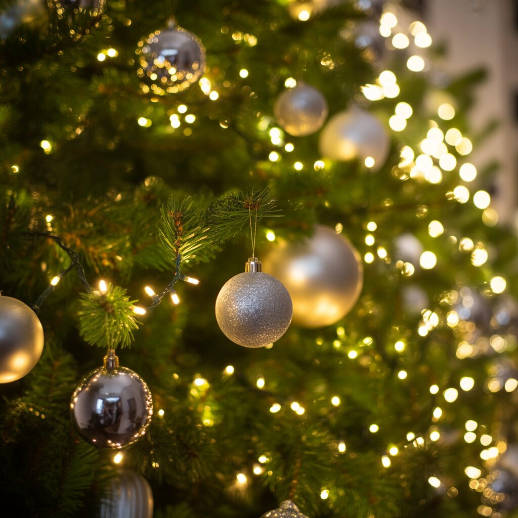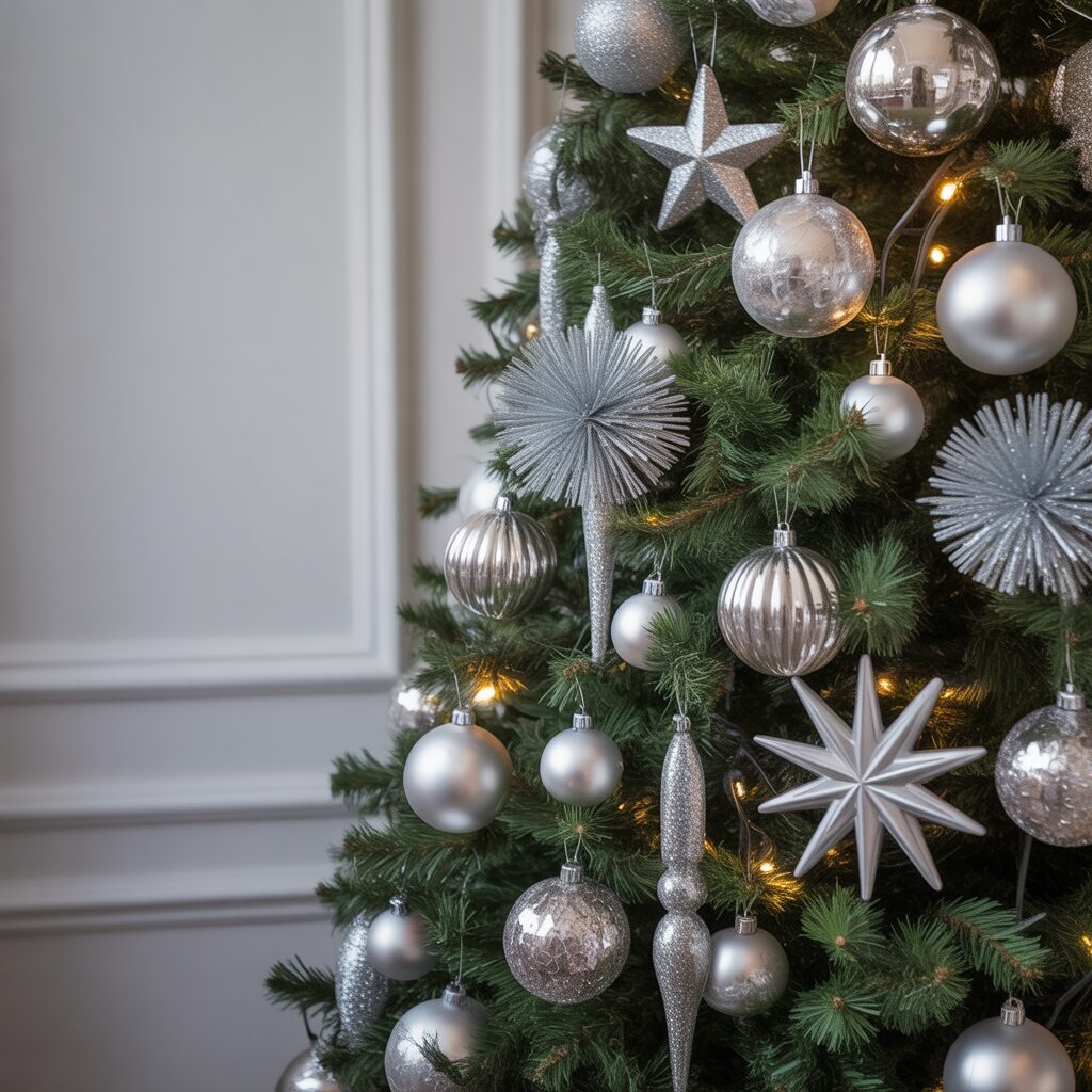 Use silver baubles, stars, and icicles to add shimmer. Silver ornaments reflect light beautifully and bring a sparkling festive touch.