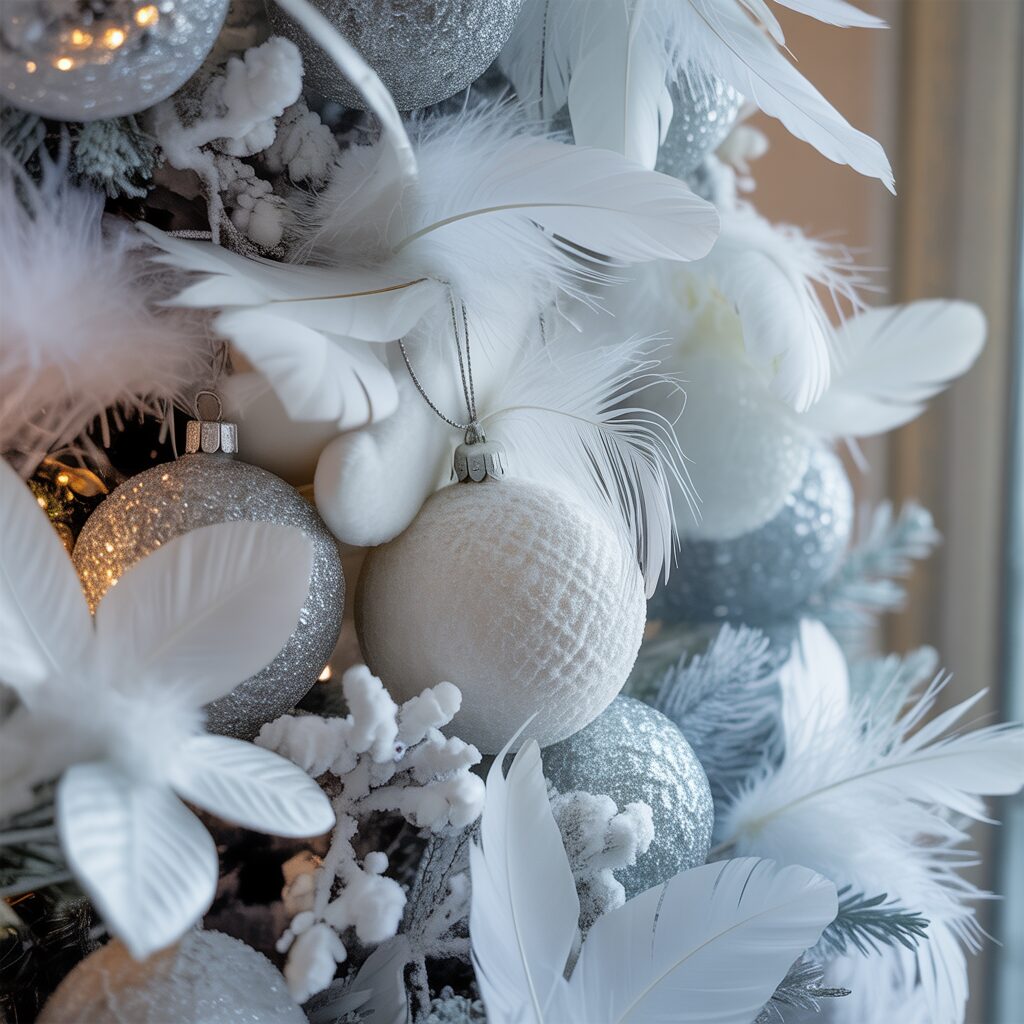 Incorporate white snowflakes, feathers, or frosted ornaments. White decorations create a clean, snowy effect that complements the silver perfectly.