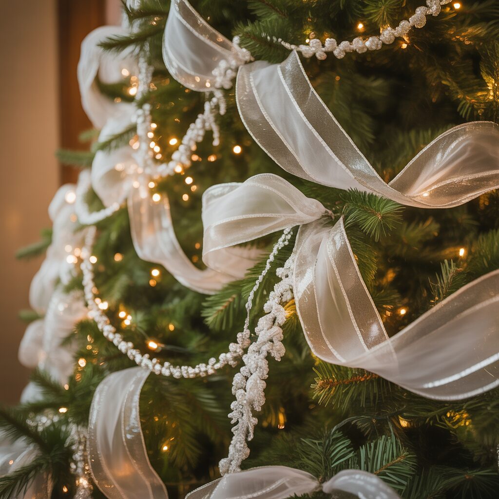 Drape silver or white ribbons and garlands around the tree. These add texture, depth, and a cohesive festive look.