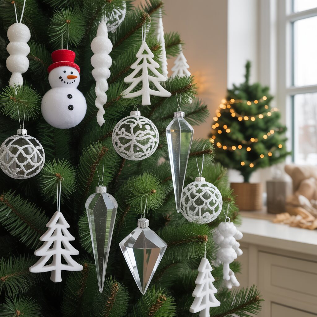 Add themed accents like snowmen, icicles, or crystal shapes. Themed ornaments enhance the winter wonderland vibe of the tree.