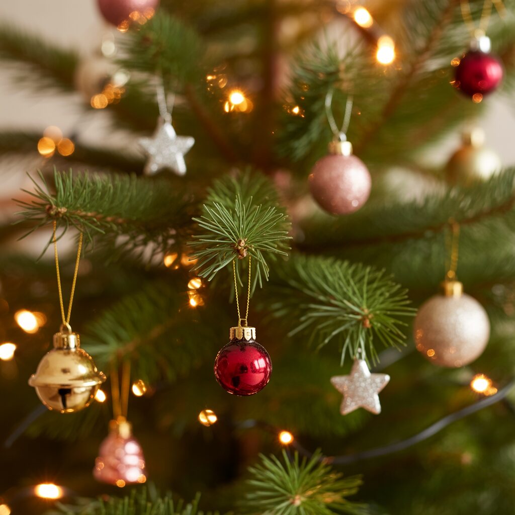 Use small-sized ornaments to prevent the tree from looking overcrowded. Tiny baubles, stars, and bells maintain balance and enhance the festive feel.