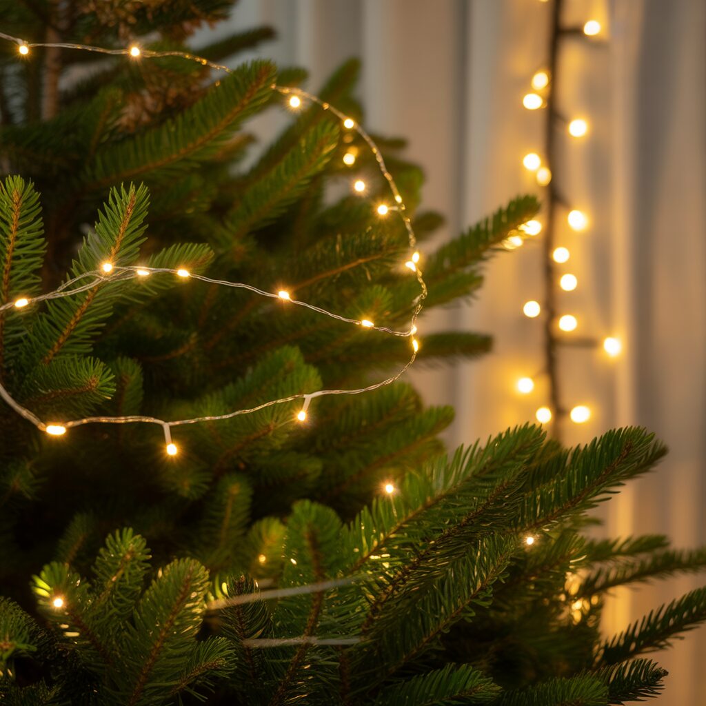 String small fairy lights around the tree to add sparkle without overwhelming the branches. Warm white or multicolored lights create a cozy glow.