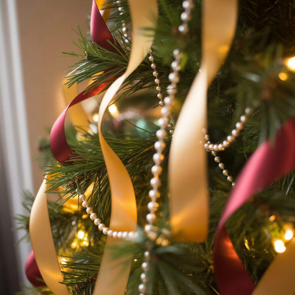 Drape thin ribbons or delicate garlands around the tree. Lightweight decorations add texture and color while keeping the tree proportionate.