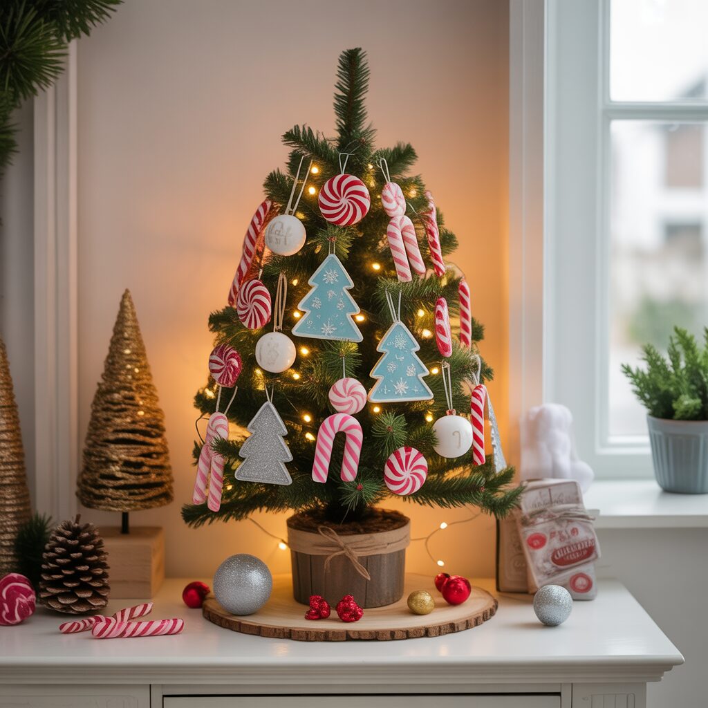 Choose a theme like candy, winter wonderland, or rustic charm. A consistent theme keeps the small tree stylish and visually appealing.