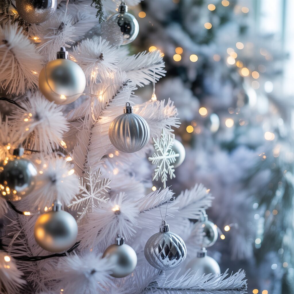 A white tree paired with silver ornaments and sparkling lights creates a magical, icy effect. This theme feels fresh, elegant, and perfect for a winter-inspired display.