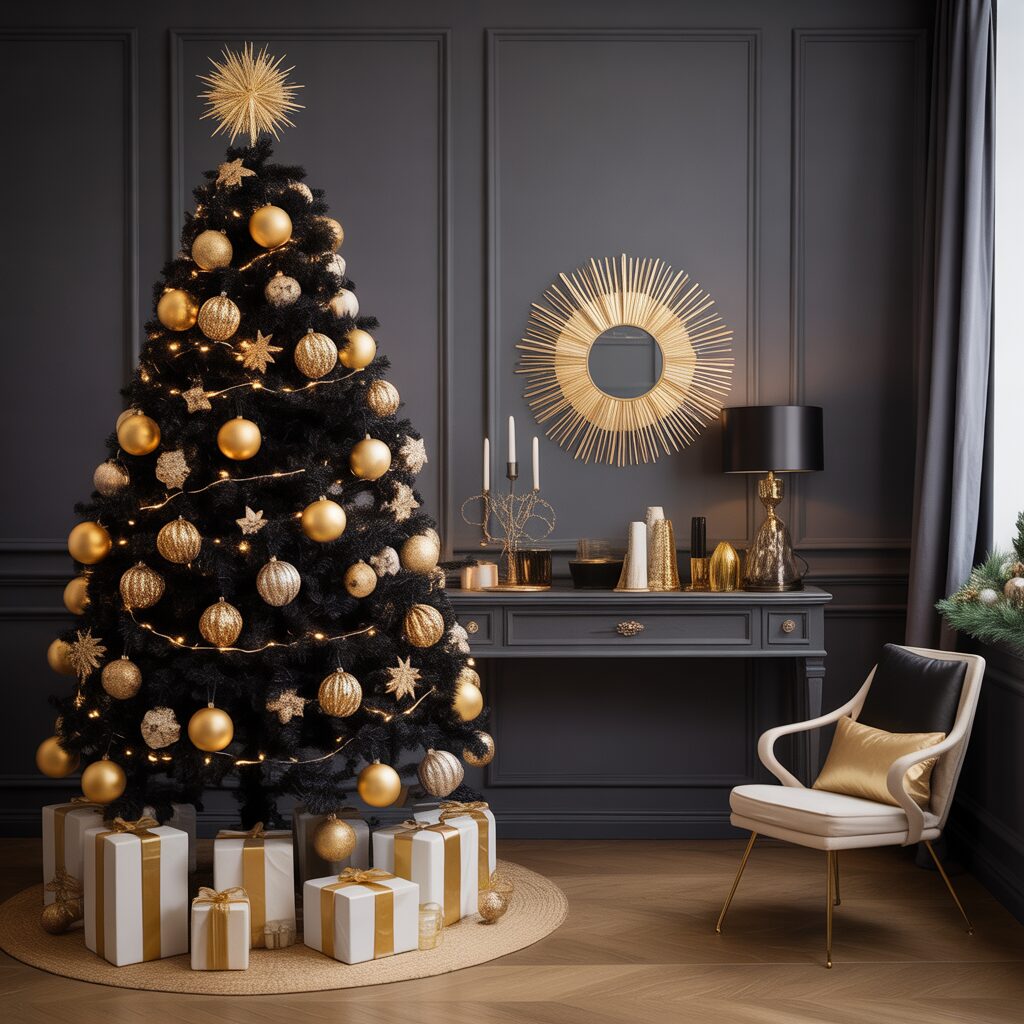 Using a black tree with gold accents creates a bold and sophisticated look. The contrast makes ornaments and lights stand out for a luxurious holiday style.