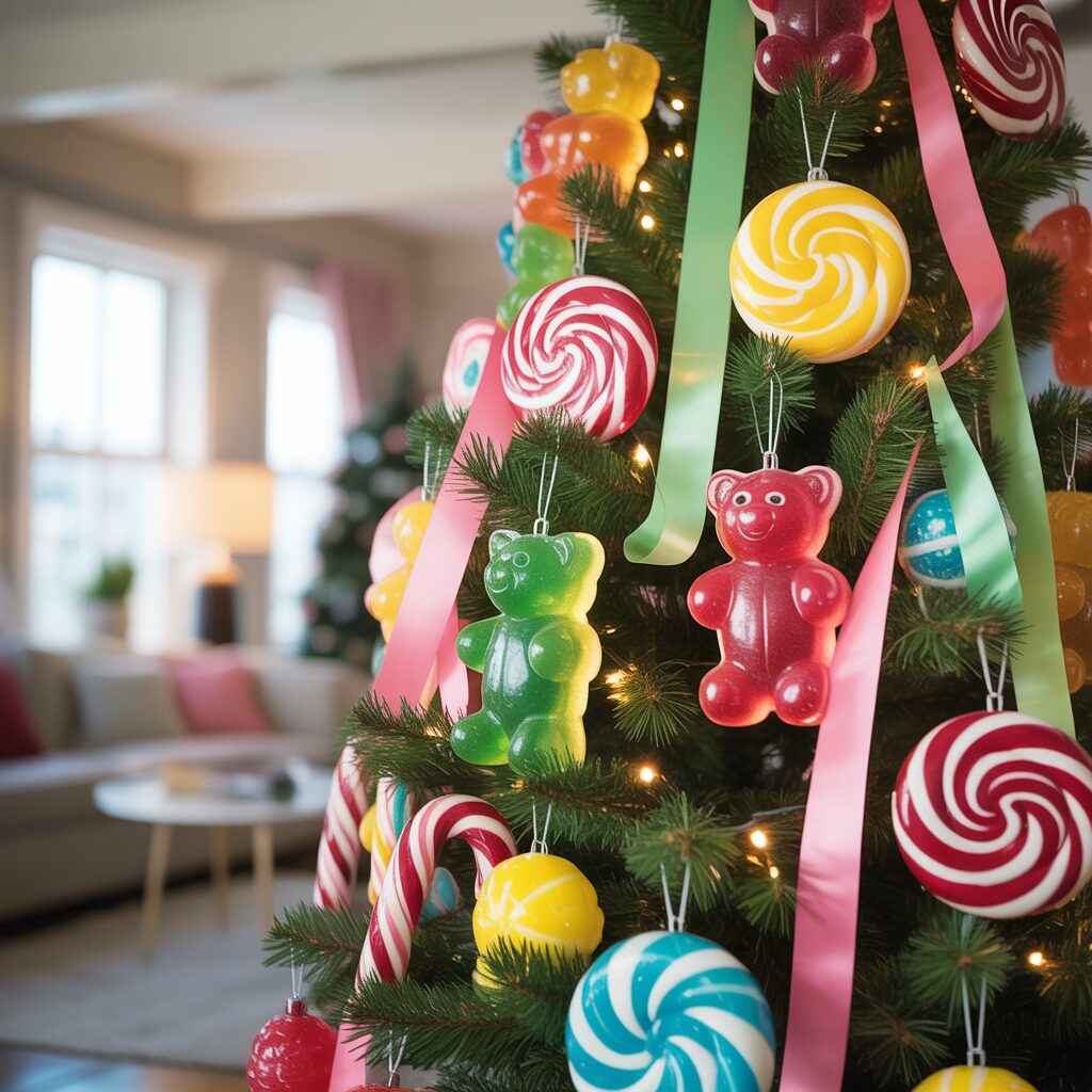 Bright, oversized candy ornaments and colorful ribbons create a whimsical and playful tree. This theme is ideal for families and adds a joyful, cheerful atmosphere.